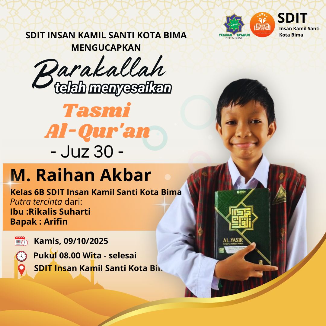 Kota Bima (Senin, 13 Oktober 2025) - SDIT Insan Kamil Santi Kota Bima mengucapkan, BARAKALLAHU abang M. Raihan Akbar siswa kelas 6B SDIT Insan Kamil Santi Kota Bima, putra dari Ibu Rikalis Suharti dan Bapak Arifin, telaha menyelesaikan TASMI' ALQUR'AN JUZ 30. Pada hari Kamis tanggal 09 Oktober 2025 pukul 08.00 - selesai di SDIT Insan Kamil Santi Kota Bima. Semoga tetap istiqomah dalam menjaga hafalan alqur'annya. Allahummarhamna bil Qur'an.