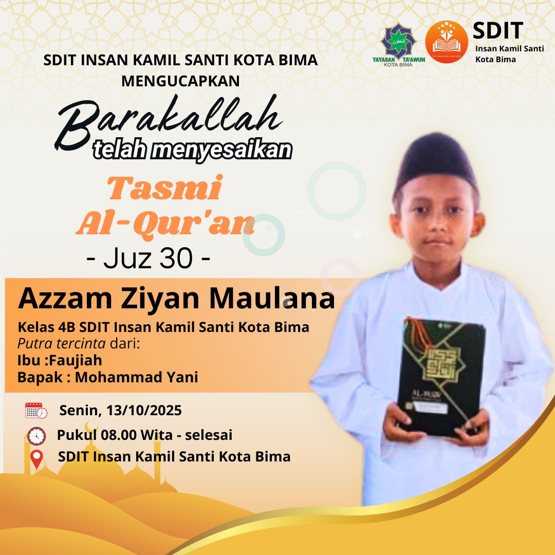 Kota Bima (Senin, 13 Oktober 2025) - SDIT Insan Kamil Santi Kota Bima mengucapkan, BARAKALLAHU Abang Azzam Ziyan Maulana siswa kelas 4B SDIT Insan Kamil Santi Kota Bima, putra dari Ibu Faujiah dan Bapak Mohammad Yani telah menyelesaikan TASMI' ALQUR'AN JUZ 30. Pada hari Senin tanggal 13 Oktober 2025 pukul 08.00 - selesai di SDIT Insan Kamil Santi Kota Bima. Semoga tetap istiqomah dalam menjaga hafalan alqur'annya. Allahummarhamna bil Qur'an.