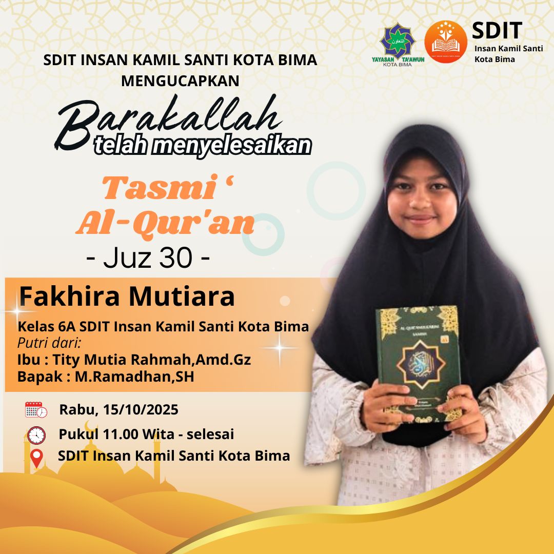 Kota Bima (Rabu, 15 Oktober 2025) - SDIT Insan Kamil Santi Kota Bima mengucapkan, BARAKALLAH kakak Fakhira Mutiara Bahrein siswa kelas 6A SDIT Insan Kamil Santi Kota Bima, putri dari Ibu Tity Mutia Rahmah,Amd.Gz dan Bapak M. Ramadhan,SH telah menyelesaikan TASMI' ALQUR'AN JUZ 30. Pada hari Rabu tanggal 15 Oktober 2025 pukul 11.00 - selesai di SDIT Insan Kamil Santi Kota Bima. Semoga tetap istiqomah dalam menjaga hafalan alqur'annya. Allahummarhamna bil Qur'an.