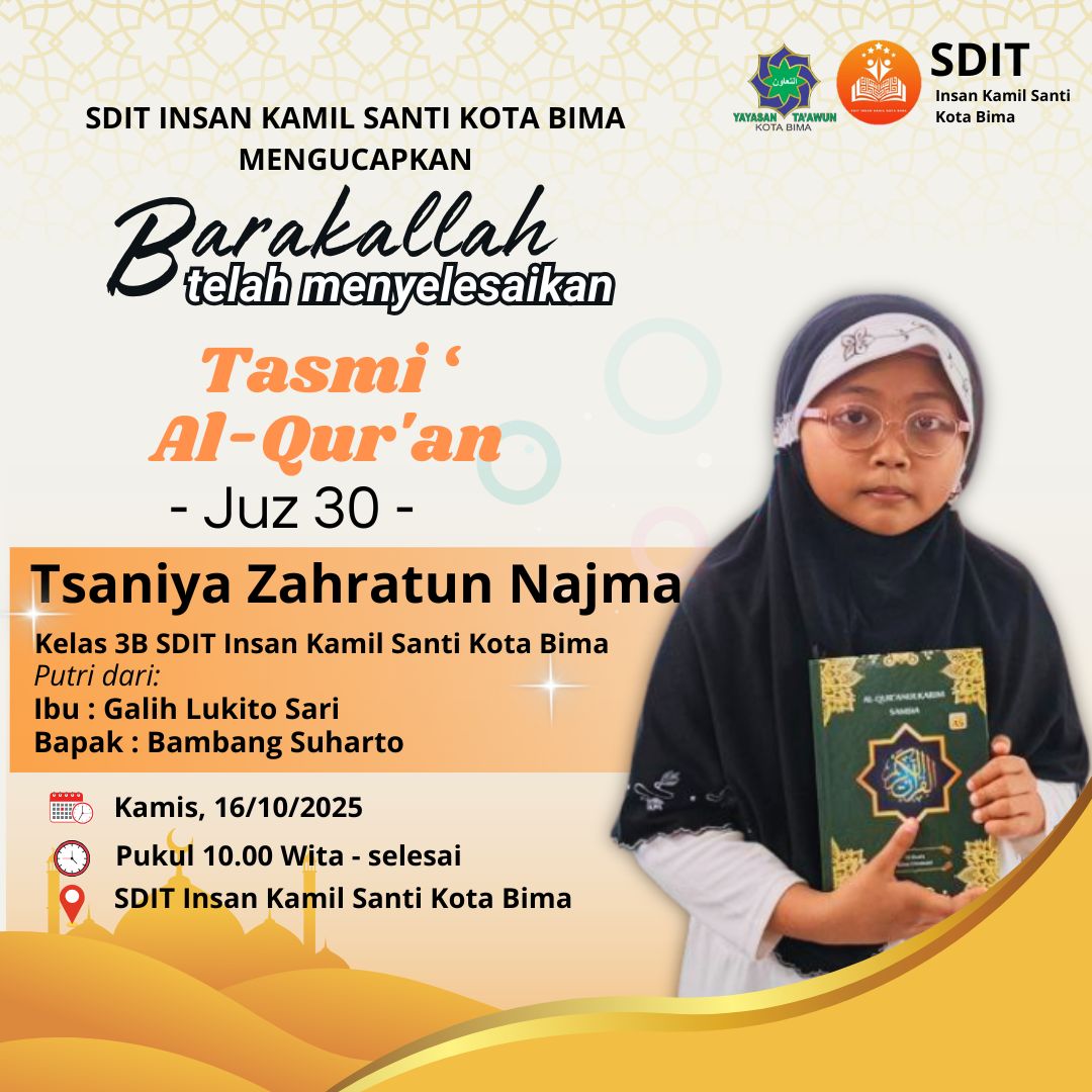 Kota Bima (Kamis, 16 Oktober 2025) - SDIT Insan Kamil Santi Kota Bima mengucapkan, BARAKALLAH kakak Tsaniya Zahratun Najma siswa kelas 3B SDIT Insan Kamil Santi Kota Bima, putri dari Ibu Galih Lukito Sari dan Bapak Bambang Suharto telah menyelesaikan TASMI' ALQUR'AN JUZ 30. Pada hari Kamis tanggal 16 Oktober 2025 pukul 10.00 - selesai di SDIT Insan Kamil Santi Kota Bima. Semoga tetap istiqomah dalam menjaga hafalan alqur'annya. Allahummarhamna bil Qur'an.